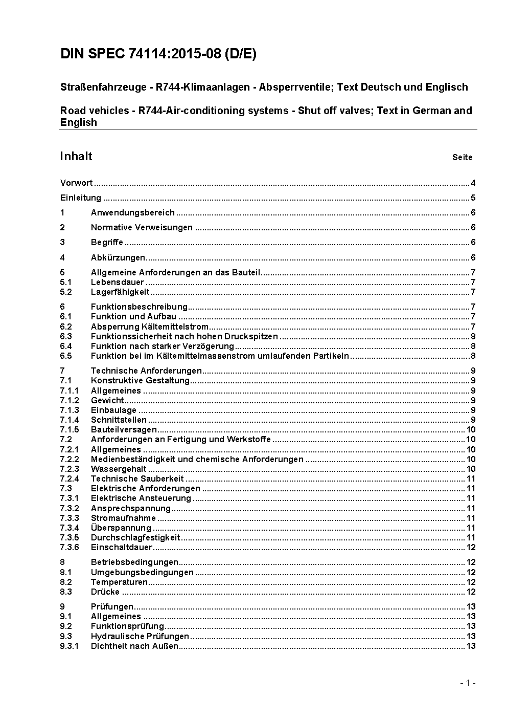 This DIN SPEC describes the functions and requirements for the quality, strength and lifetime as well as the related tests for the shut-off valve which are operated in motor vehicle air-conditioning systems with refrigerant R744.