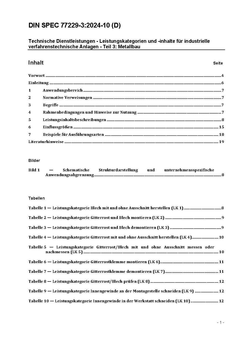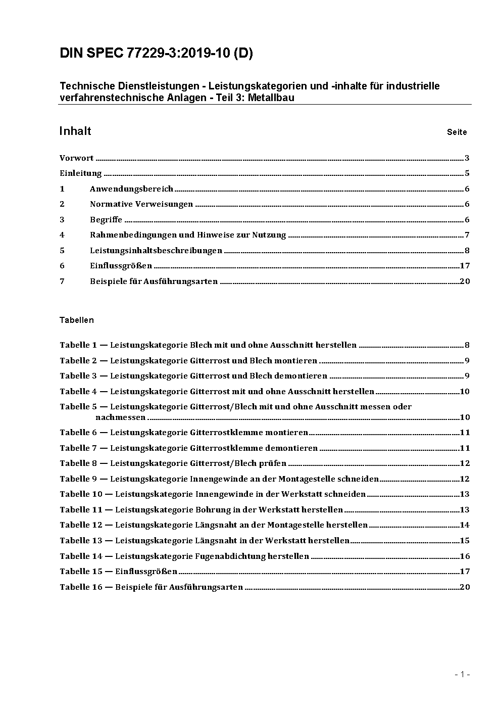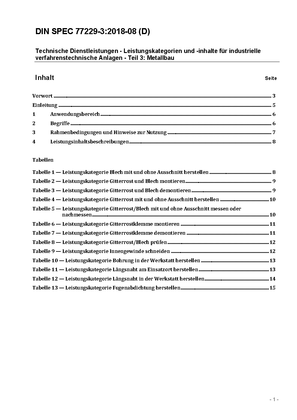 This DIN SPEC has been drawn up by a temporary body ('Workshop') in accordance with the PAS procedure. This DIN SPEC has been developed and approved by the authors named in the Foreword. This DIN SPEC will specifies a standard for service categories and its service contents for industrial process engineering systems. The afore mentioned categories and their service contents are used as a basis for the description and assessment of items in standard services catalogues. The thermal, cold and sound insulation encompasses service categories for prefabrication, assembly and disassembly in industrial plants in the field and at industrial locations. The service contents defined in this DIN SPEC are not in accordance with the German construction contract procedures (VOB) and do not provide any formulation guidance for services of building and civil construction, hydraulic and transport engineering as these are contained in the Standard Library of Descriptions of Building Works (STLB-Bau) and in the Standard Library of Descriptions of temporary contracts (STLB-BauZ).