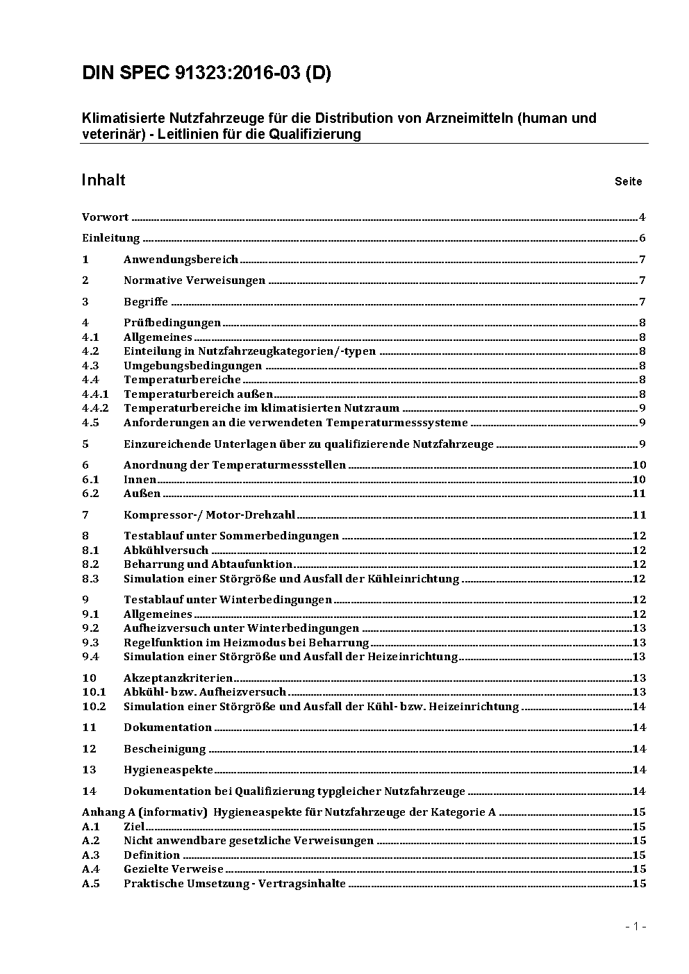 This DIN SPEC was drawn up by a temporary body ('workshop') in accordance with the PAS procedure. It was developed and approved by the authors named in the Foreword. This DIN SPEC specifies test requirements relating to the functional and performance qualification of air-conditioned vehicles used to deliver pharmaceutical products that are to be transported within a certain temperature range. It does not include criteria by which to rate the thermal insulating, heating and/or refrigerating capacity. The DIN SPEC also does not cover special requirements for the qualification of vehicles used to transport pharmaceutical products such as medical gases.