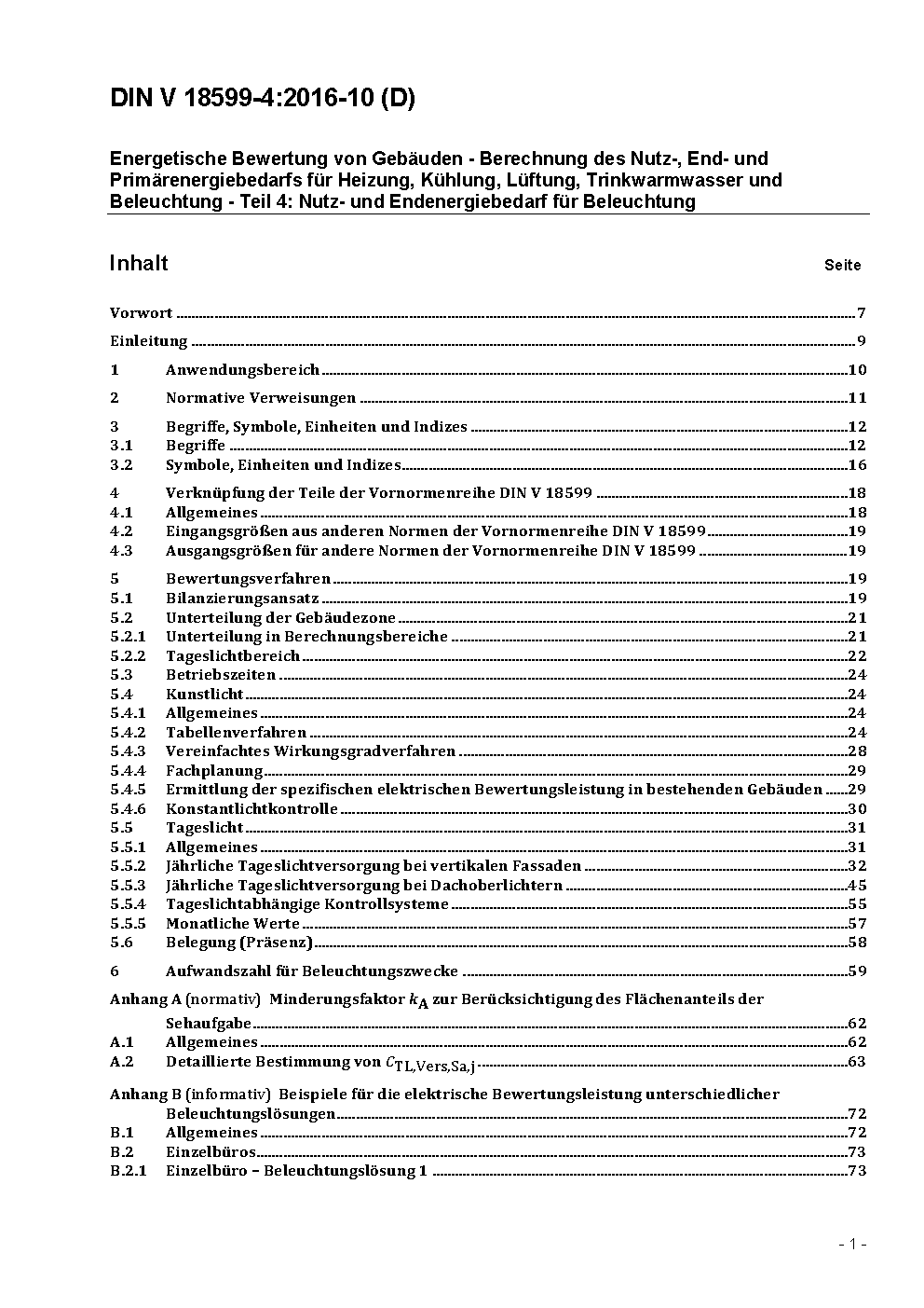 This document specifies the verification procedure for the determination of the final energy demand for lighting purposes in non-residential buildings per month/year. This procedure includes the required zoning of the building in respect of lighting techniques, the determination of the specific electrical evaluation of the artificial lighting system, the deference of daylight use and of the influence of motion detector systems.