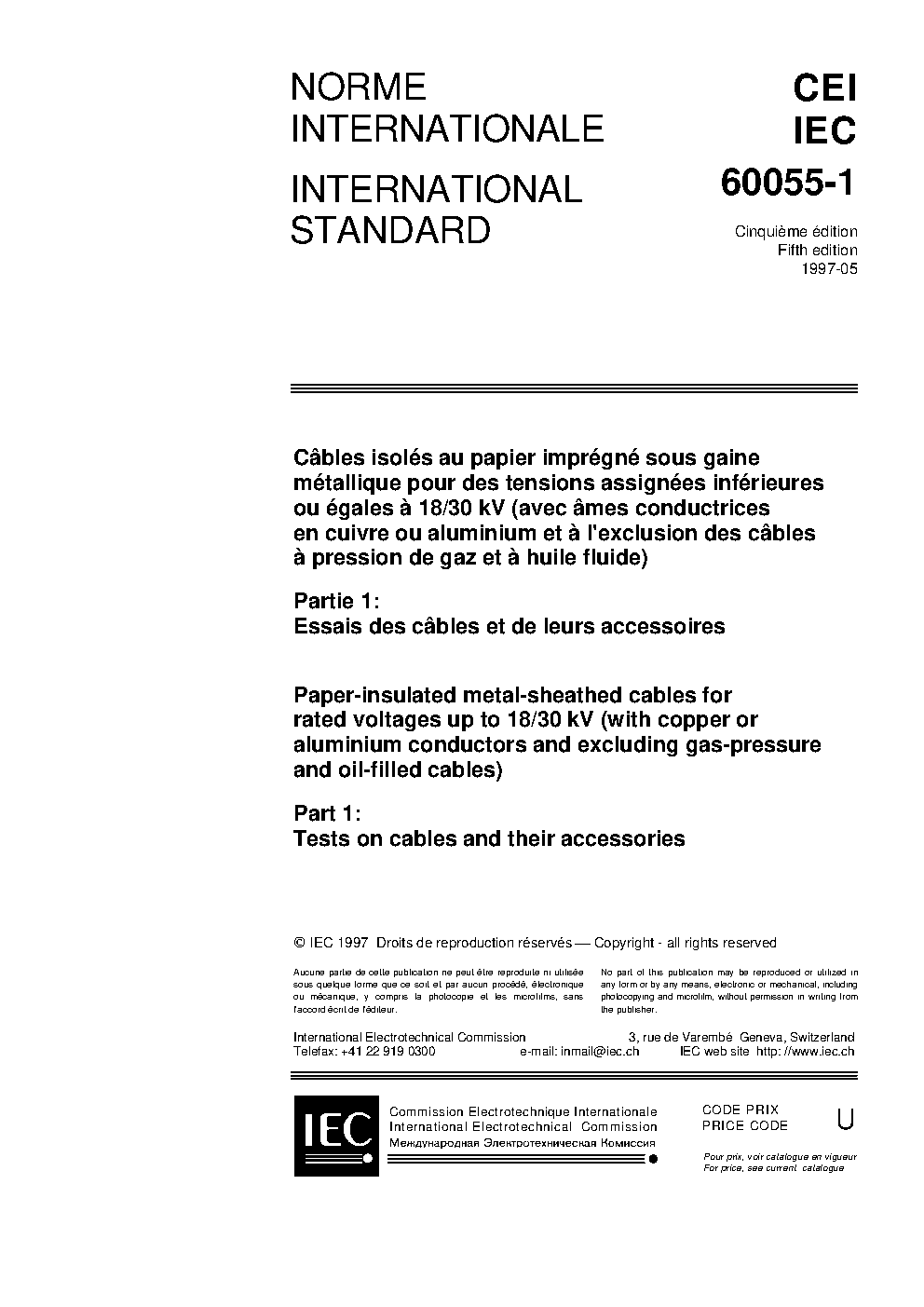 IEC 60055-1:1997 Paper-insulated metal-sheathed cables for rated voltages up to 18/30 kV (with copper or aluminium conductors and excluding gas-pressure and oil-filled cables) - Part 1: Tests on cables and their accessories