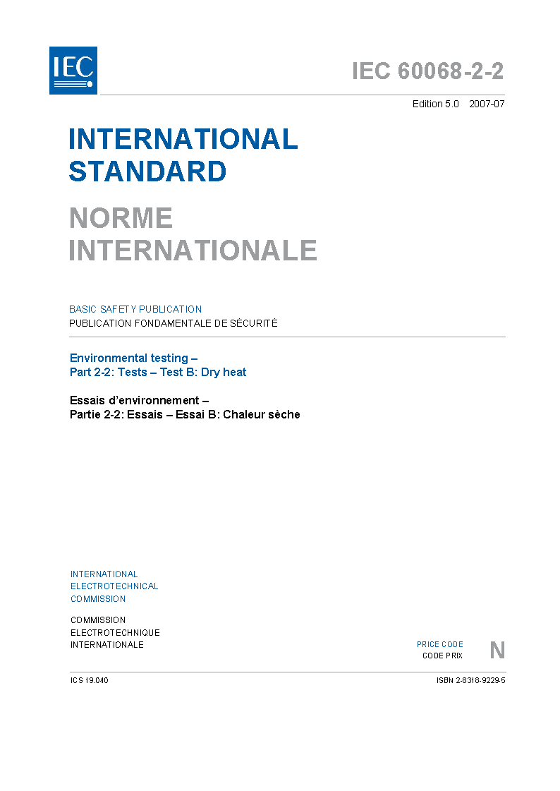 IEC 60068-2-2:2007 Deals with dry heat tests applicable both to heat-dissipating and non heat-dissipating specimens. For non heat-dissipating specimens, Tests Bb and Bd do not deviate essentially from earlier issues. The object of the dry heat test is limited to the determination of the ability of components, equipment or other articles to be used, transported or stored at high temperature. These dry heat tests do not enable the ability of specimens to withstand or operate during the temperature variations to be assessed. In this case, it would be necessary to use IEC 60068-2-14 Test N: Change of temperature. The dry heat tests are subdivided as follows: