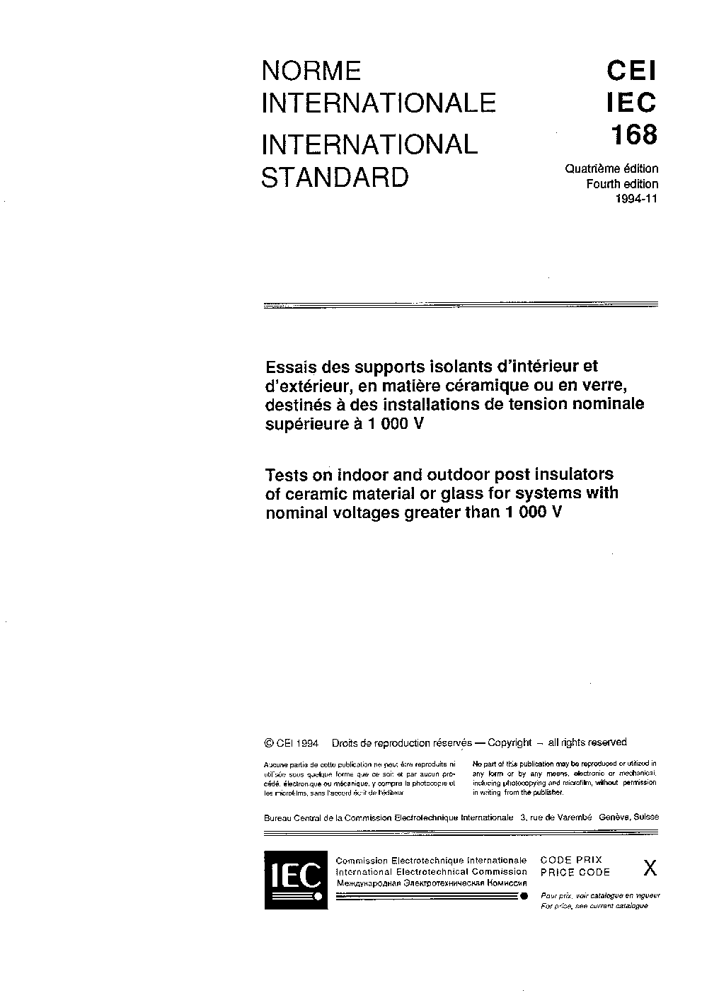 IEC 60168:1994 Tests on indoor and outdoor post insulators of ceramic material or glass for systems with nominal voltages greater than 1000 V