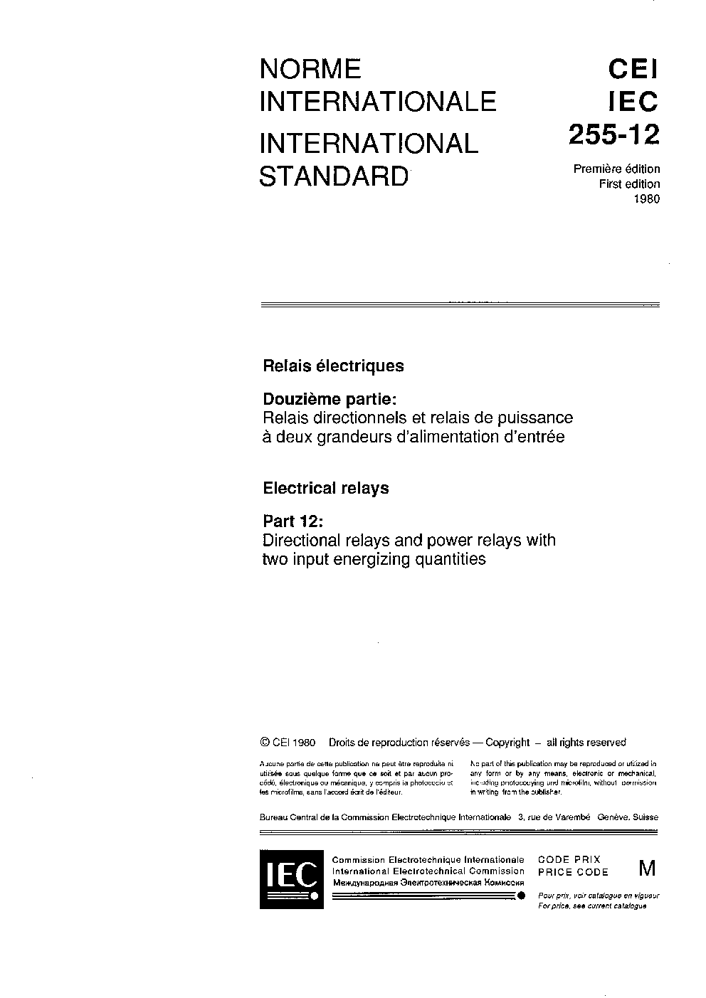IEC 60255-12:1980 Electrical relays - Part 12: Directional relays and power relays with two input energizing quantities