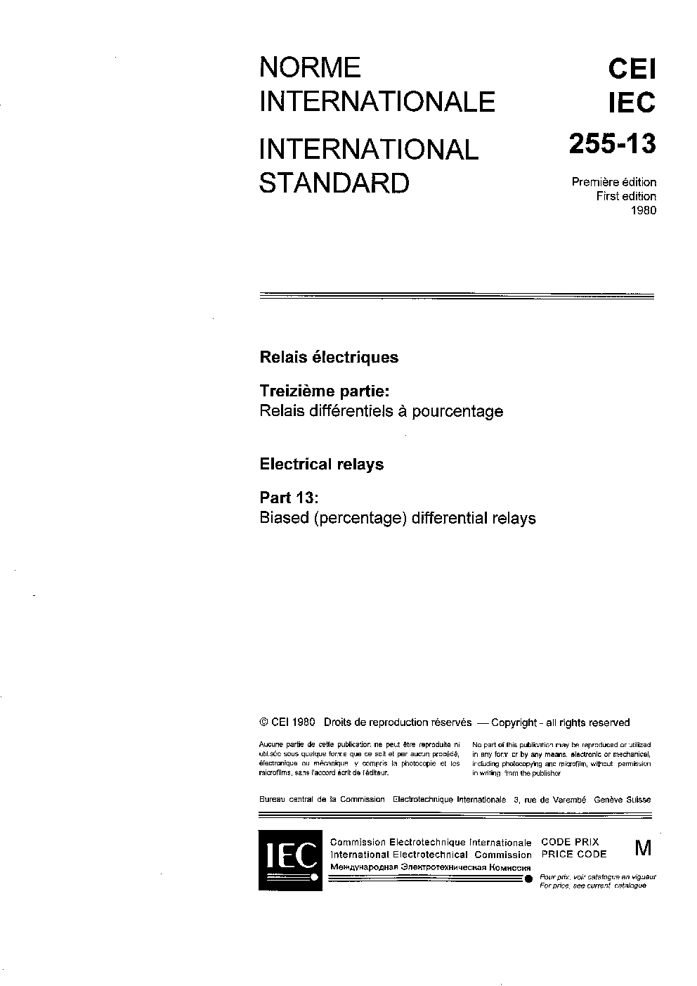 IEC 60255-13:1980 Electrical relays - Part 13: Biased (percentage) differential relays
