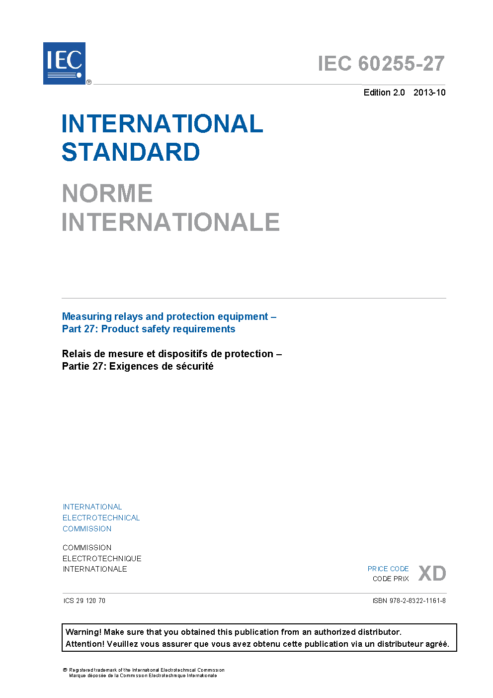 IEC 60255-27:2013 describes the product safety requirements for measuring relays and protection equipment having a rated a.c. voltage up to 1 000 V with a rated frequency up to 65 Hz, or a rated d.c. voltage up to 1 500 V. Above these limits, IEC 60664-1 is applicable for the determination of clearance, creepage distance and withstand test voltage. This standard details essential safety requirements to minimize the risk of fire and hazards caused by electric shock or injury to the user. This new edition includes the following significant technical changes with respect to the previous edition: