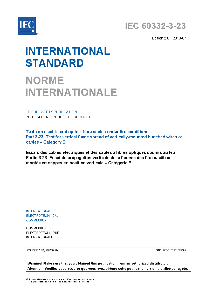 IEC 60332-3-23:2018 Tests on electric and optical fibre cables under fire conditions - Part 3-23: Test for vertical flame spread of vertically-mounted bunched wires or cables - Category B