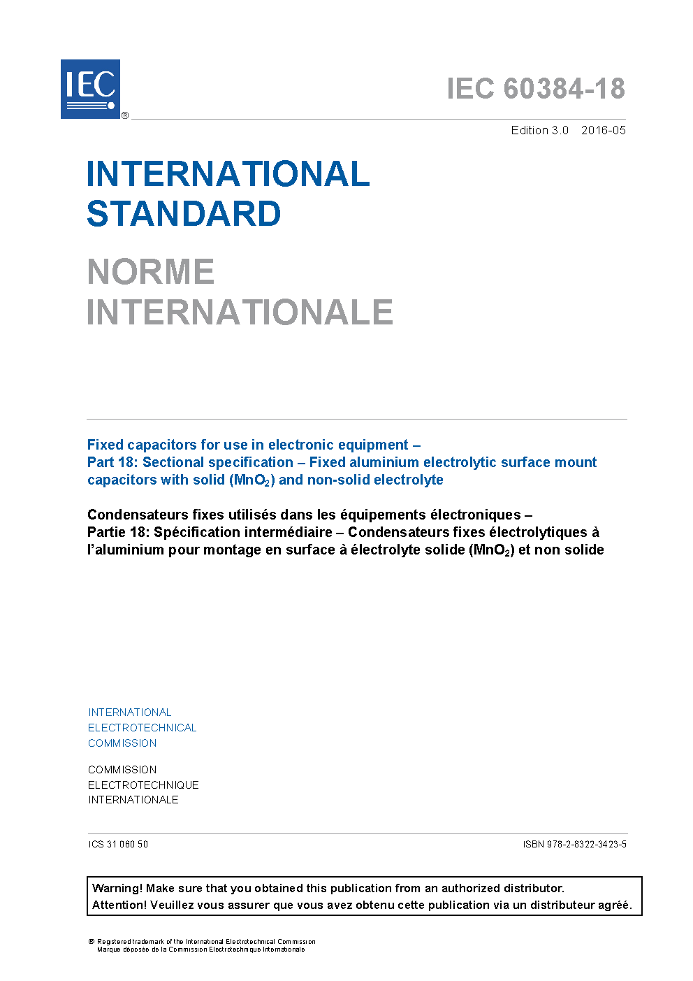 IEC 60384-18:2016 Fixed capacitors for use in electronic equipment - Part 18: Sectional specification - Fixed aluminium electrolytic surface mount capacitors with solid (MnO2) and non-solid electrolyte