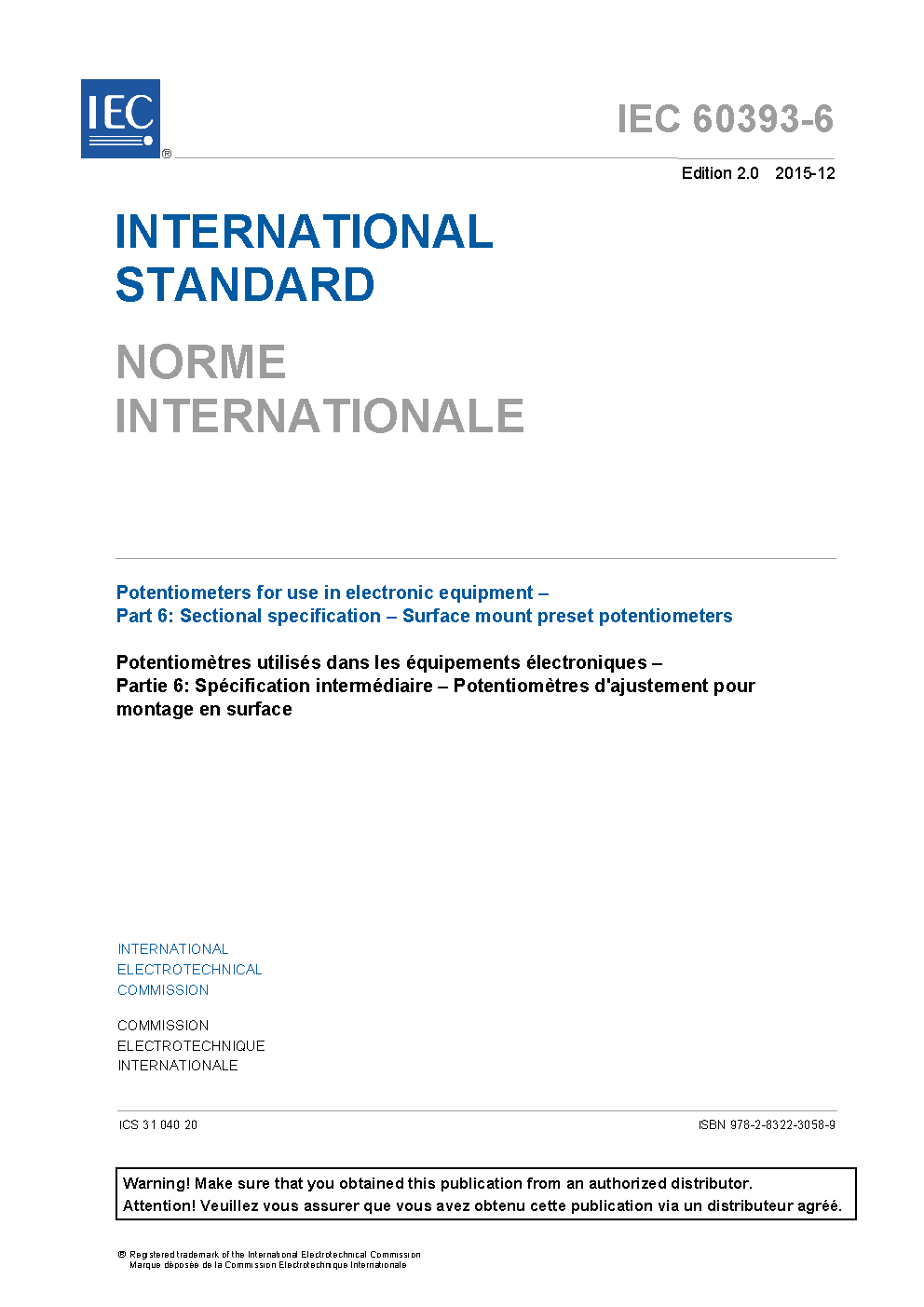 IEC 60393-6:2015 Potentiometers for use in electronic equipment - Part 6: Sectional specification - Surface mount preset potentiometers
