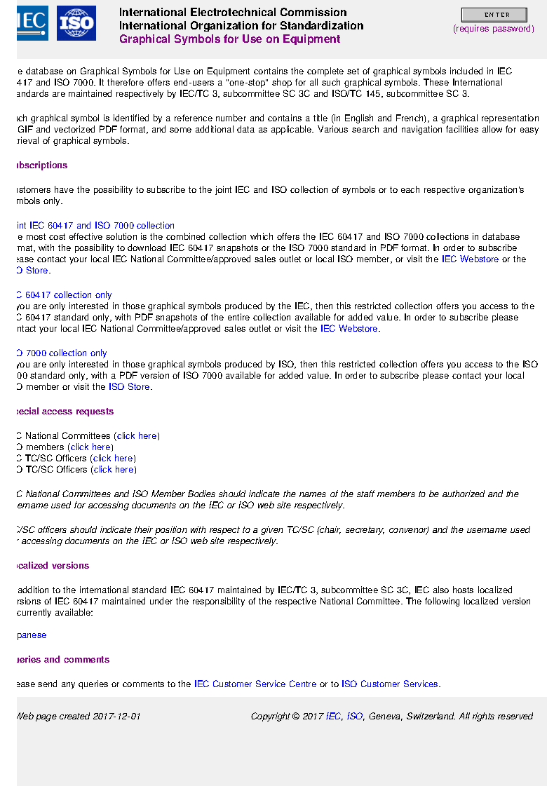 IEC 60417:2002 DB contains graphical symbols used to identify equipment or a part of equipment, indicate functional states, designate connections, provide information on packaging or provide instruction for the operation of the equipment. A graphical symbol is a visually perceptible figure used to transmit information independently of language. Each graphical symbol is identified by a reference number and contains a title (in English and French), a graphical representation in GIF and vectorized PDF format, and some additional data as applicable. Various search and navigation facilities allow for easy retrieval of graphical symbols. For all graphical symbols published in IEC 60417 and ISO 7000 please click here.