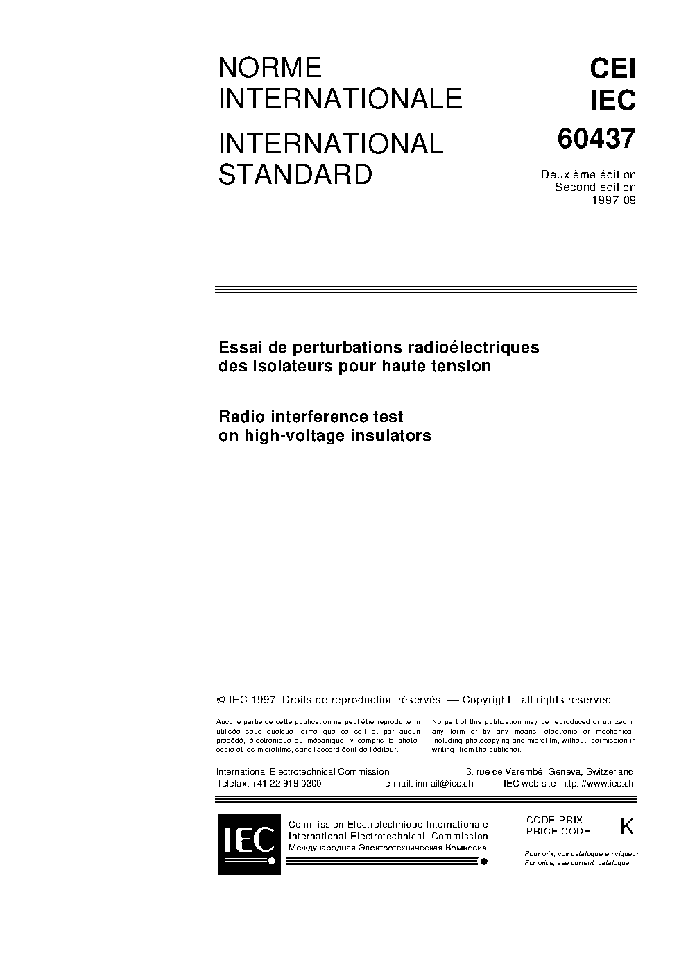 IEC 60437:2023 specifies the procedure for a radio interference (RI) test carried out in a laboratory on clean and dry insulators at a frequency of 0,5 MHz or 1 MHz or, alternatively, at other frequencies between 0,5 MHz and 2 MHz.