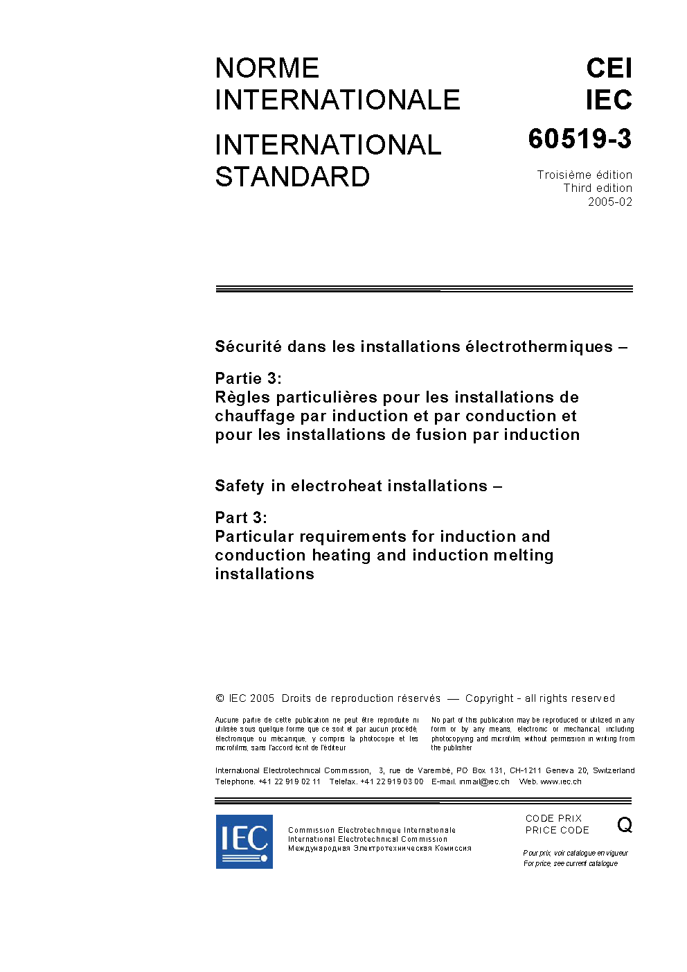 IEC 60519-3:2005 Safety in electroheat installations - Part 3: Particular requirements for induction and conduction heating and induction melting installations
