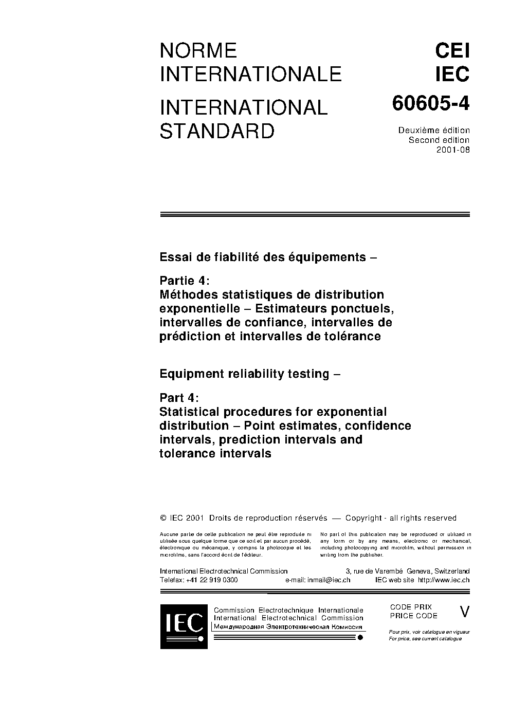IEC 60605-4:2001 Equipment reliability testing - Part 4: Statistical procedures for exponential distribution - Point estimates, confidence intervals, prediction intervals and tolerance intervals