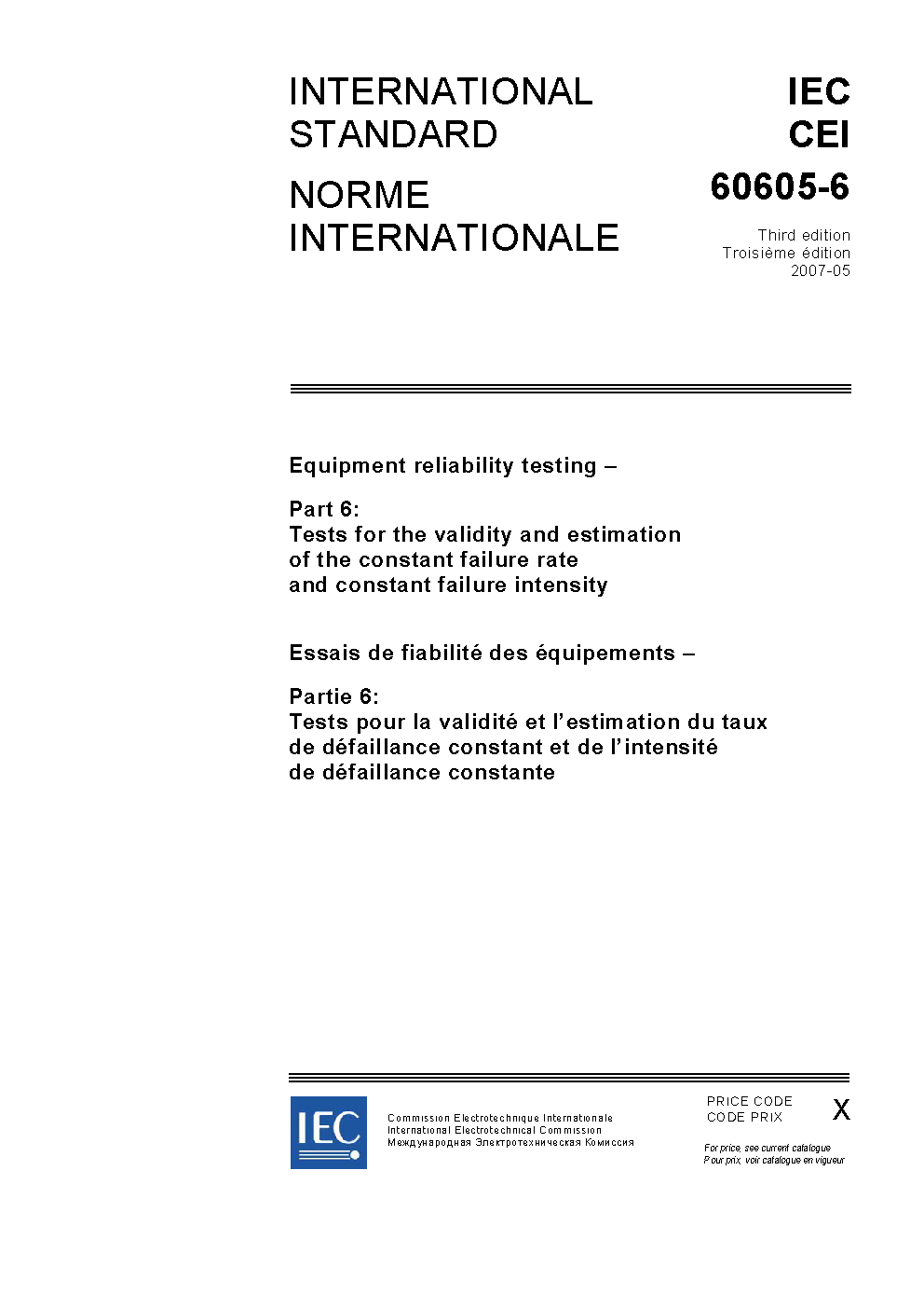 IEC 60605-6:2007 Equipment reliability testing - Part 6: Tests for the validity and estimation of the constant failure rate and constant failure intensity