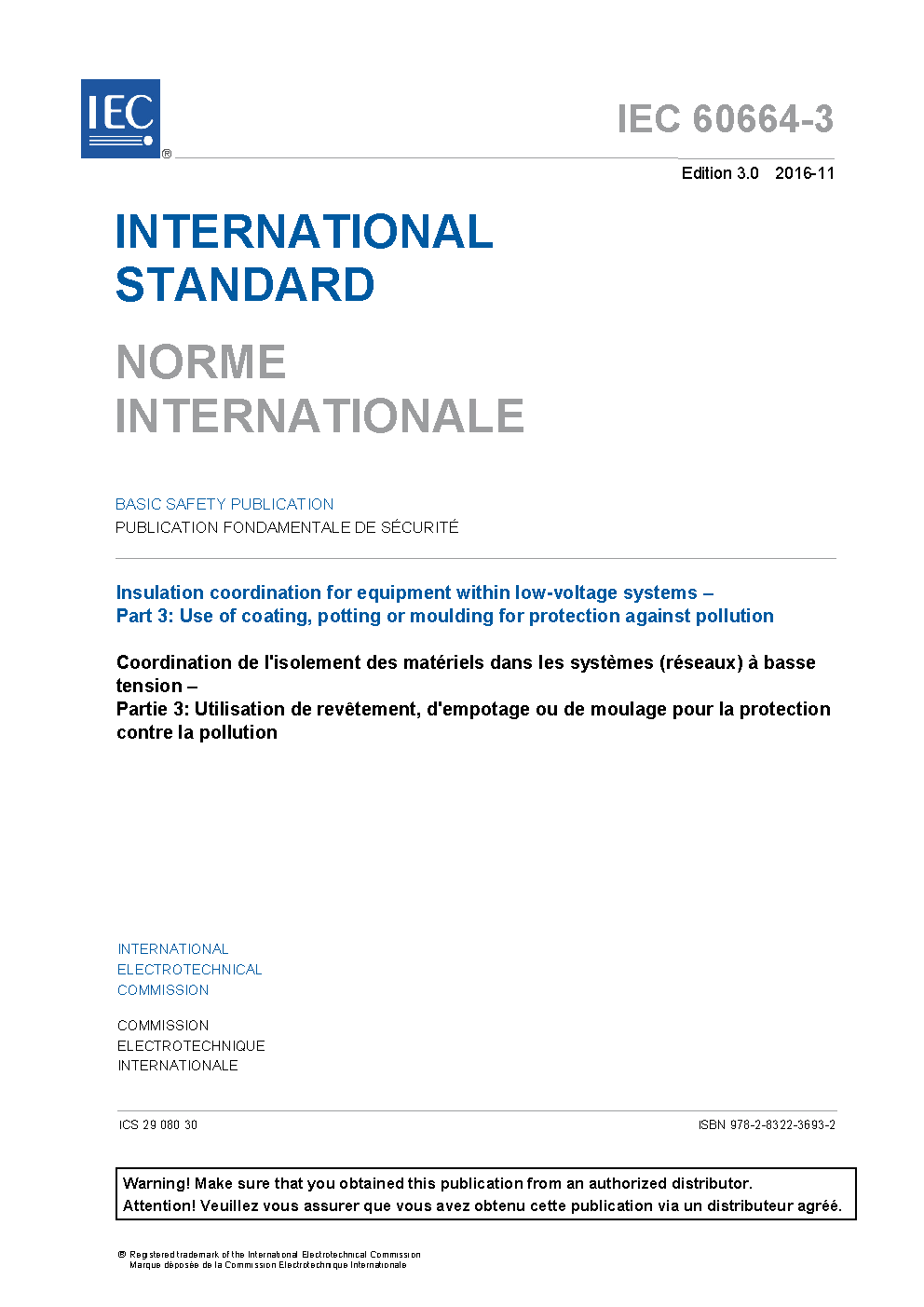 IEC 60664-3:2016 Insulation coordination for equipment within low-voltage systems - Part 3: Use of coating, potting or moulding for protection against pollution