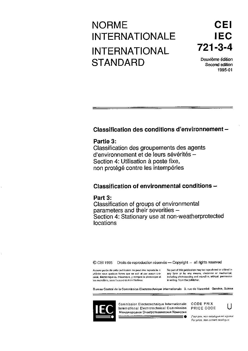 IEC 60721-3-4:2019 classifies groups of environmental parameters and their severities to which products are subjected when installed for stationary use at non-weatherprotected locations. Weatherprotected locations where products can be mounted for stationary use permanently or temporarily are addressed in IEC 60721-3-3.