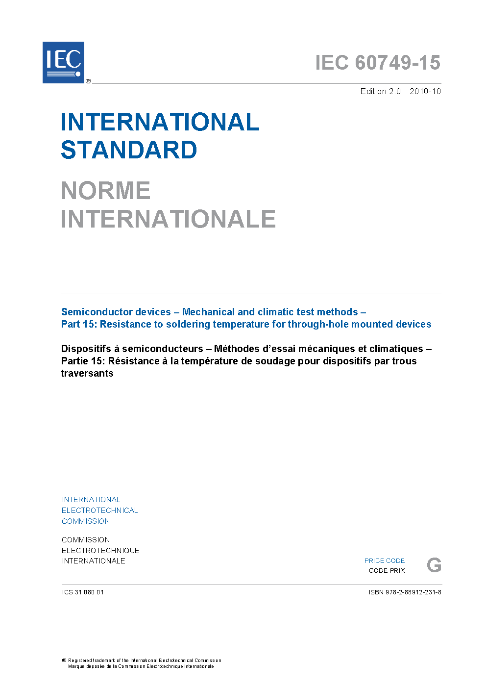 IEC 60749-15:2010 describes a test used to determine whether encapsulated solid state devices used for through-hole mounting can withstand the effects of the temperature to which they are subjected during soldering of their leads by using wave soldering or a soldering iron. This second edition cancels and replaces the first edition published in 2003 and constitutes a technical revision. The significant changes with respect from the previous edition include: