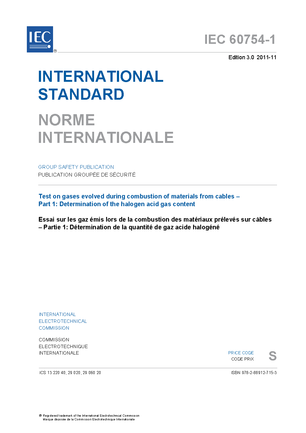 IEC 60754-1:2011 Test on gases evolved during combustion of materials from cables - Part 1: Determination of the halogen acid gas content