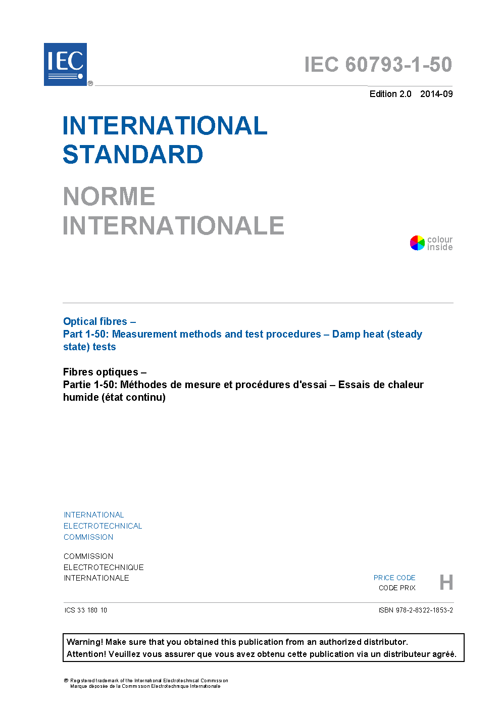 IEC 60793-1-50:2014 Optical fibres - Part 1-50: Measurement methods and test procedures - Damp heat (steady state) tests