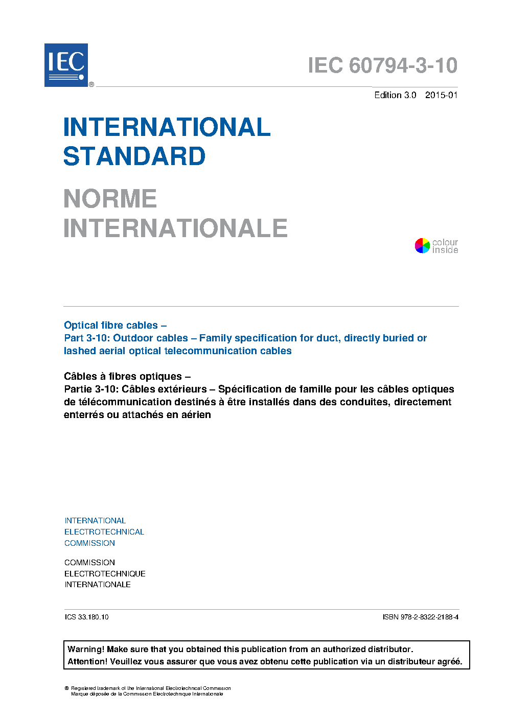 IEC 60794-3-10:2015 Optical fibre cables - Part 3-10: Outdoor cables - Family specification for duct, directly buried and lashed aerial optical telecommunication cables