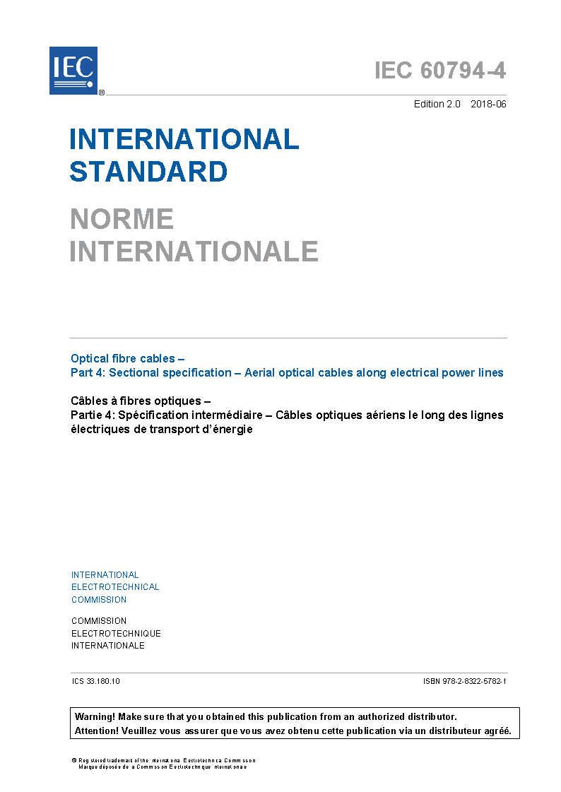 IEC 60794-4:2018 Optical fibre cables - Part 4: Sectional specification - Aerial optical cables along electrical power lines