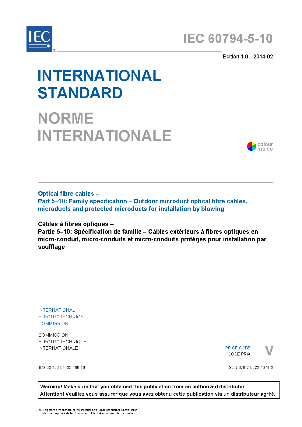 IEC 60794-5-10:2014 Optical fibre cables - Part 5-10: Family specification - Outdoor microduct optical fibre cables, microducts and protected microducts for installation by blowing