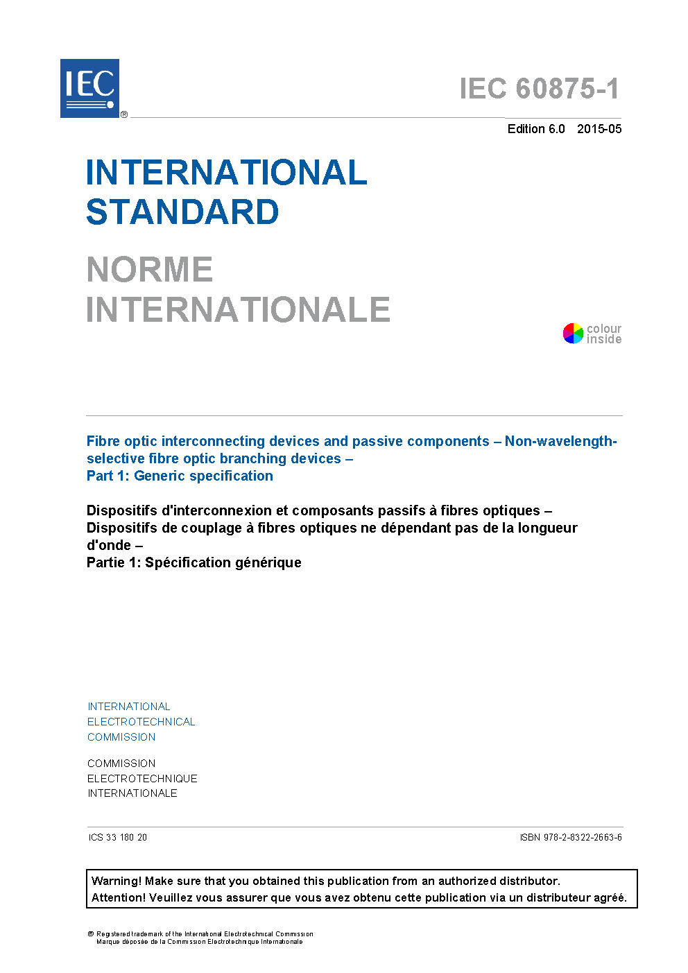 IEC 60875-1:2015 Fibre optic interconnecting devices and passive components - Non-wavelength-selective fibre optic branching devices - Part 1: Generic specification