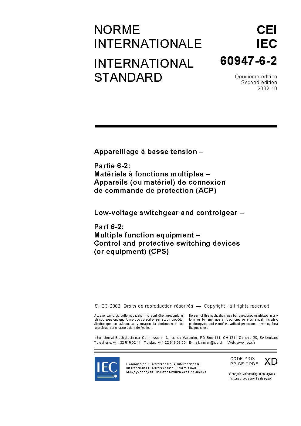 IEC 60947-6-2:2002 Low-voltage switchgear and controlgear - Part 6-2: Multiple function equipment - Control and protective switching devices (or equipment) (CPS)
