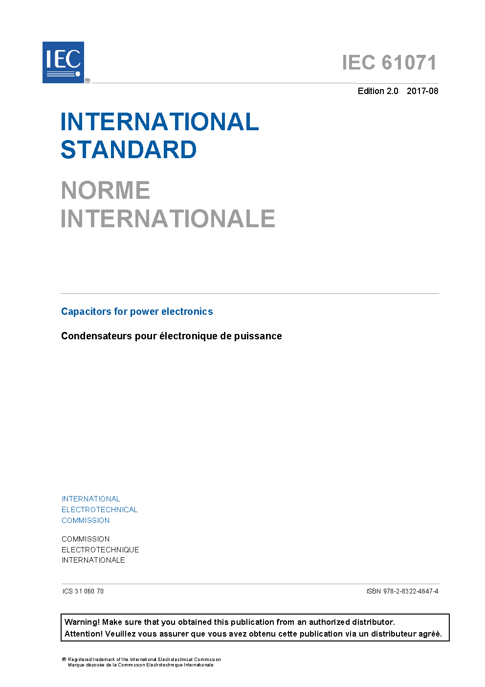 IEC 61071:2017 applies to capacitors for power electronics applications. The operating frequency of the systems in which these capacitors are used is usually up to 15 kHz, while the pulse frequencies may be up to 5 to 10 times the operating frequency. The document distinguishes between AC and DC capacitors which are considered as components when mounted in enclosures. This document covers an extremely wide range of capacitor technologies for numerous applications, e.g. overvoltage protection, DC and filtering, switching circuits, energy storage, auxiliary inverters, etc. This second edition cancels and replaces the first edition published in 2007. This edition constitutes a technical revision. This edition includes the following significant technical changes with respect to the previous edition:
