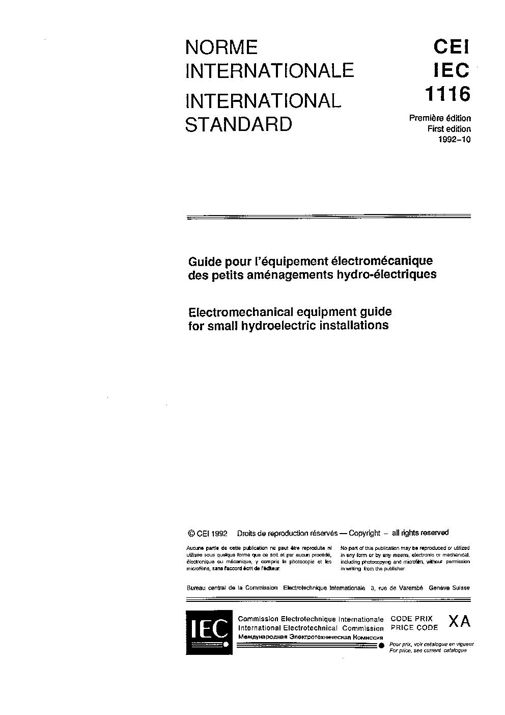 IEC 61116:1992 Electromechanical equipment guide for small hydroelectric installations