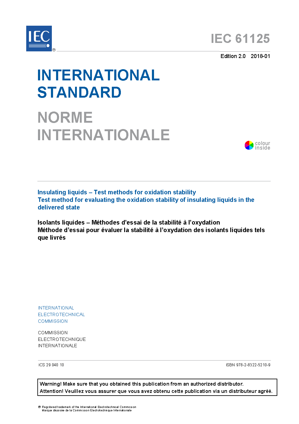 IEC 61125:2018 Insulating liquids - Test methods for oxidation stability - Test method for evaluating the oxidation stability of insulating liquids in the delivered state