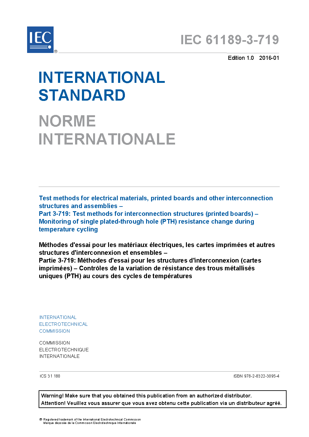 IEC 61189-3-719:2016 specifies a test method to monitor the resistance of single plated-through holes (PTHs) in printed circuit boards (PCBs) to determine the PTH durability under thermo-mechanical stress induced by temperature cycling.