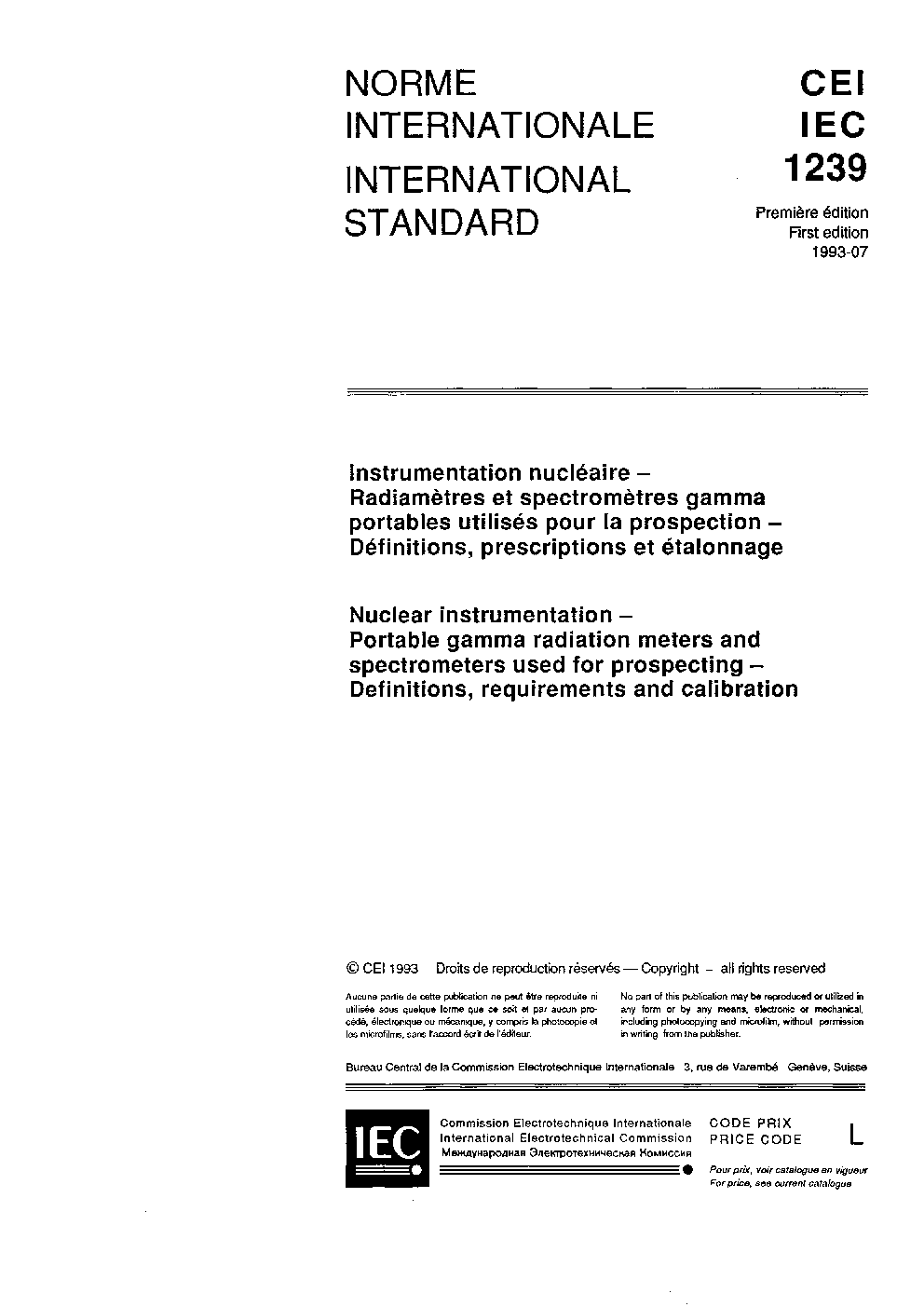 IEC 61239:1993 Nuclear instrumentation - Portable gamma radiation meters and spectrometers used for prospecting - Definitions, requirements and calibration