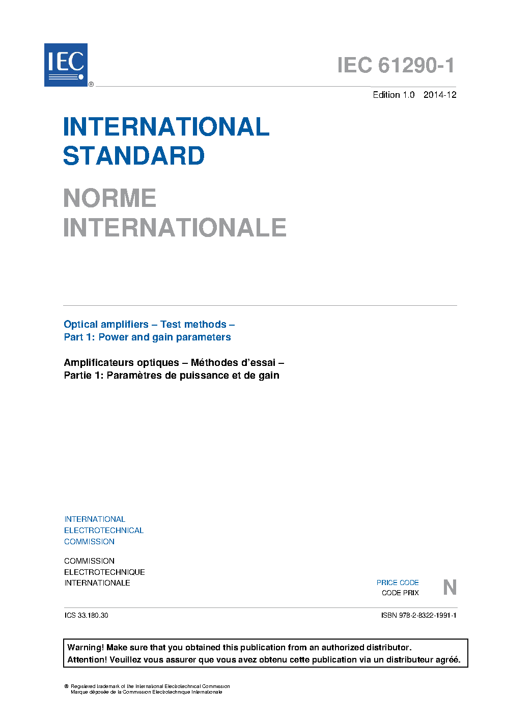IEC 61290-1:2014 Optical amplifiers - Test methods - Part 1: Power and gain parameters
