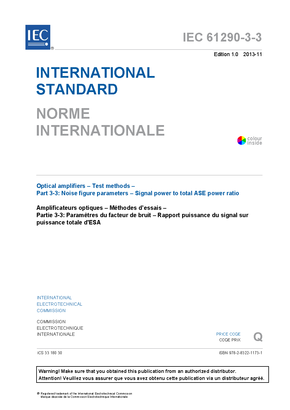 IEC 61290-3-3:2013 Optical amplifiers - Test methods - Part 3-3: Noise figure parameters - Signal power to total ASE power ratio