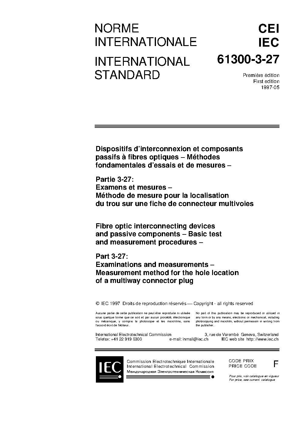 IEC 61300-3-27:1997 Fibre optic interconnecting devices and passive components - Basic test and measurement procedures - Part 3-27: Examinations and measurements - Measurement method for the hole location of a multiway connector plug