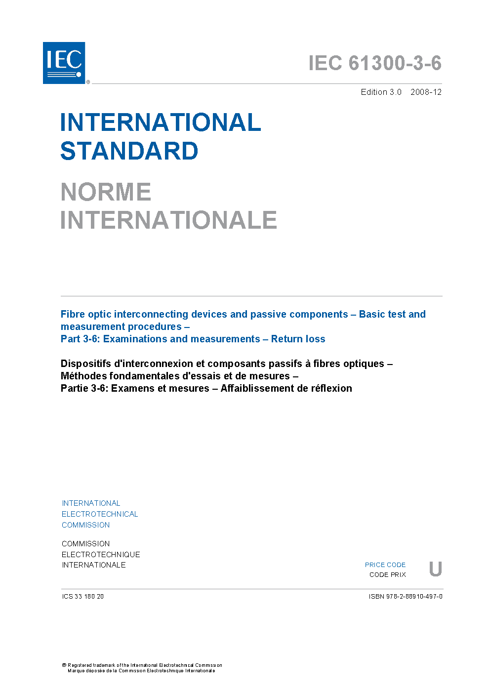 IEC 61300-3-6:2008 presents procedures for the measurement of the return loss (RL) of a fibre optic device under test (DUT). RL, as used in this standard, is the ratio of the power (Pi) incident on, or entering, the DUT to the total power reflected (Pr) by the DUT, expressed in decibels. This third edition cancels and replaces the second edition published in 2003. It constitutes a technical revision. The changes with respect to the previous edition are to reconsider the constitution of the document and launch conditions for multimode fibres.