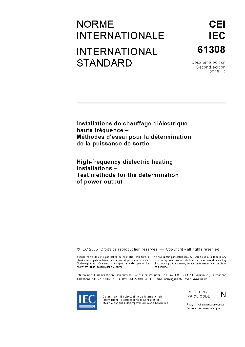 IEC 61308:2005 High-frequency dielectric heating installations - Test methods for the determination of power output