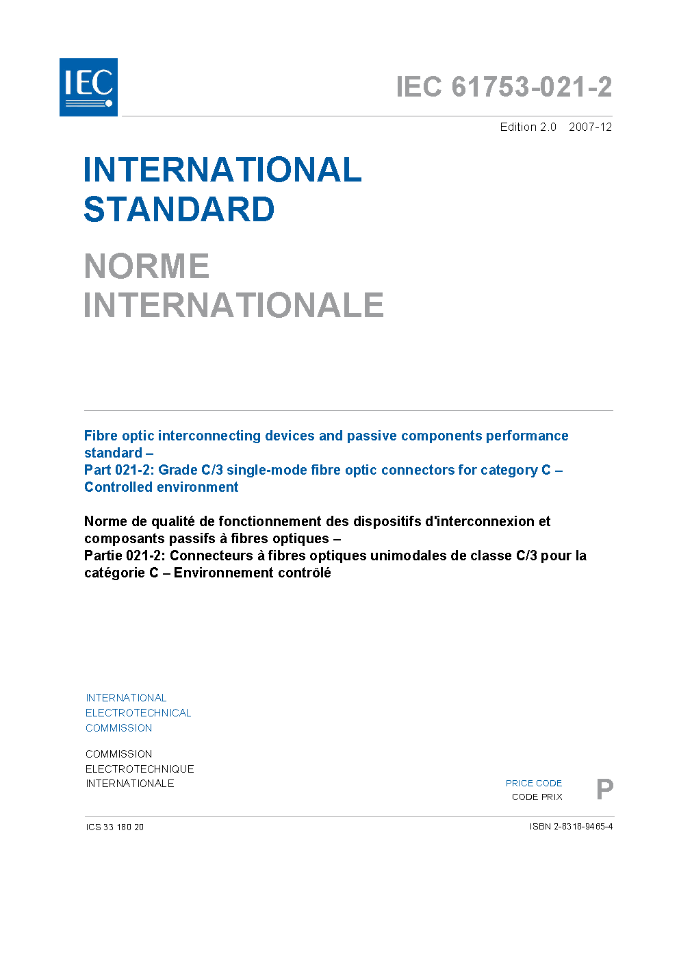 IEC 61753-021-2:2007 Fibre optic interconnecting devices and passive components performance standard - Part 021-2: Grade C/3 single-mode fibre optic connectors for category C - Controlled environment