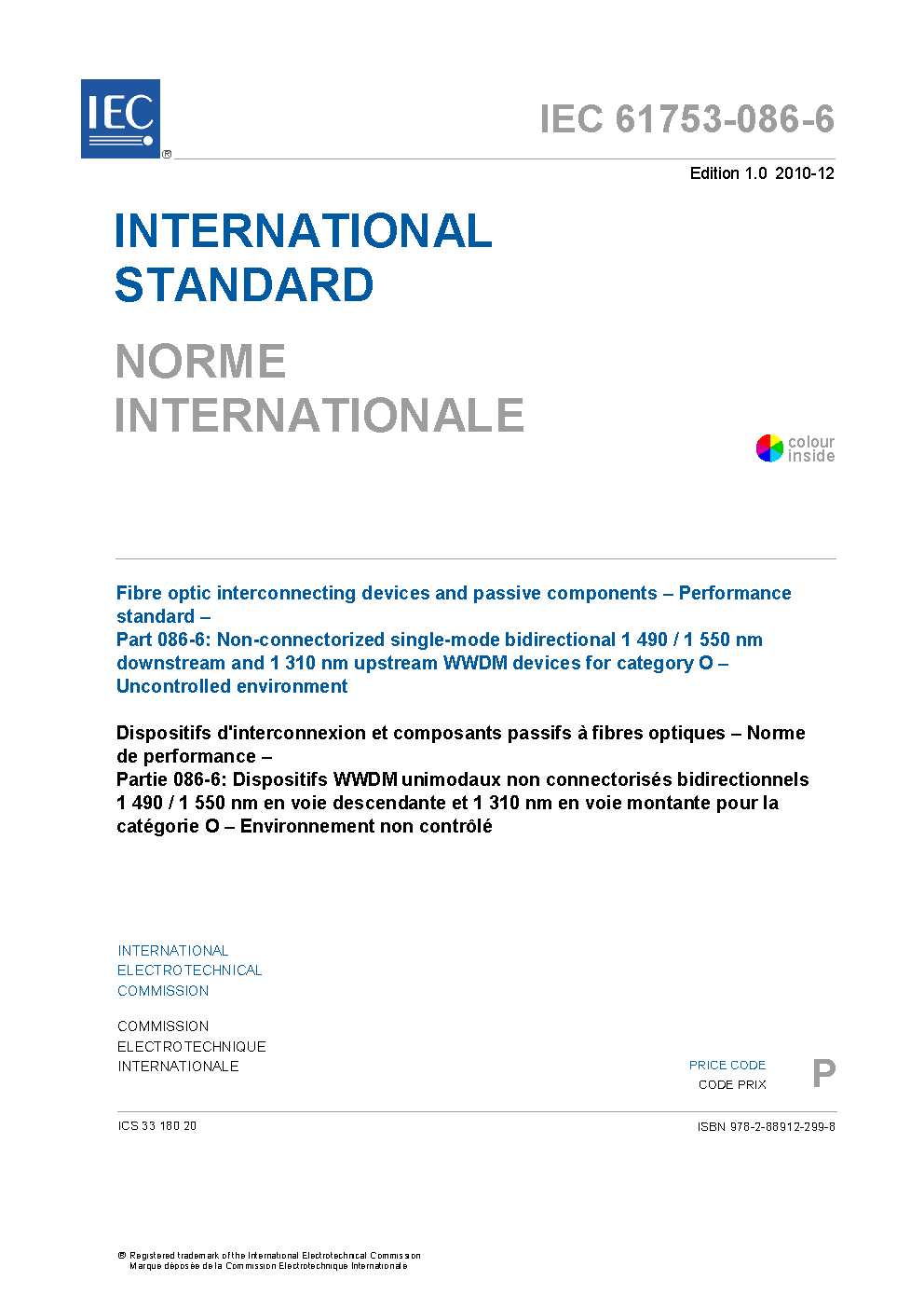 IEC 61753-086-6:2010 Fibre optic interconnecting devices and passive components - Performance standard - Part 086-6: Non-connectorized single-mode bidirectional 1 490 / 1 550 nm downstream and 1 310 nm upstream WWDM devices for category O - Uncontrolled environment