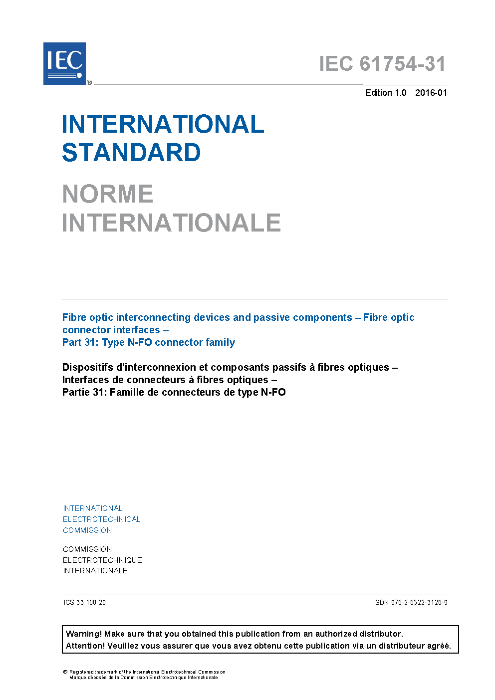 IEC 61754-31:2016 defines the standard connector interface dimensions for the two way and four way type N-FO family of connectors. Keywords: standard connector interface dimensions for the two way and four way type N-FO family of connectors