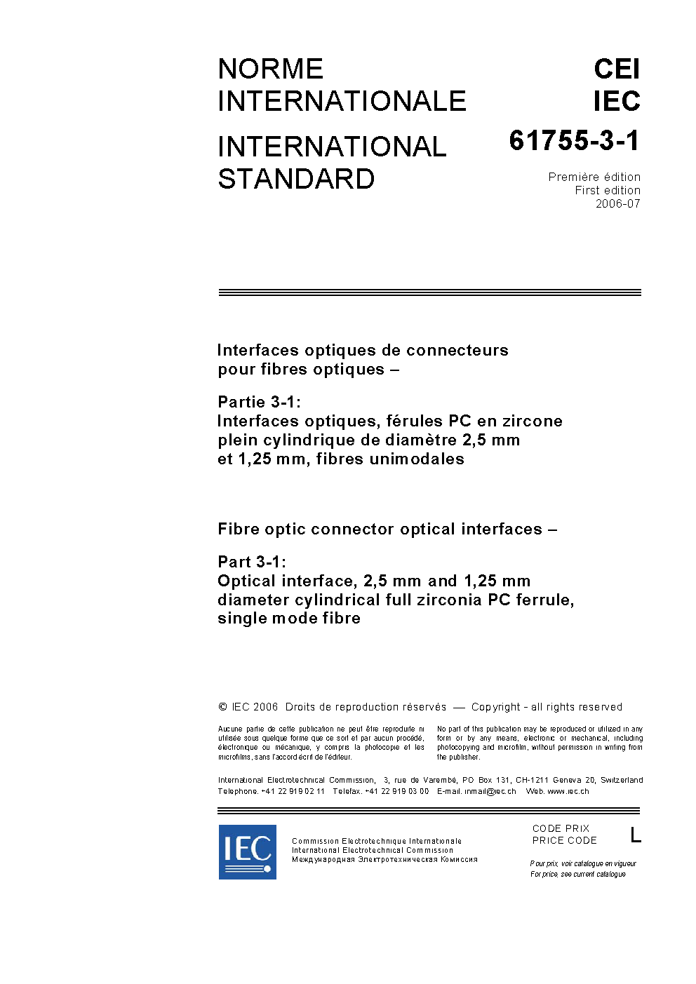 IEC 61755-3-1:2006 Fibre optic connector optical interfaces - Part 3-1: Optical interface, 2,5 mm and 1,25 mm diameter cylindrical full zirconia PC ferrule, single mode fibre