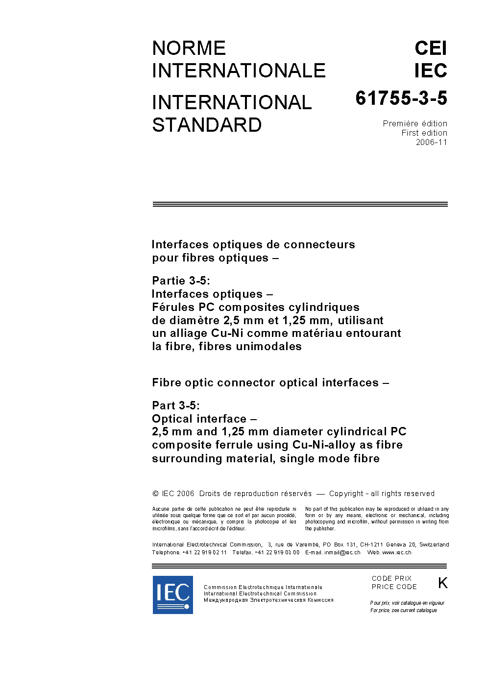 IEC 61755-3-5:2006 Fibre optic connector optical interfaces - Part 3-5: Optical interface - 2,5 mm and 1,25 mm diameter cylindrical PC composite ferrule using Cu-Ni-alloy as fibre surrounding material, single mode fibre