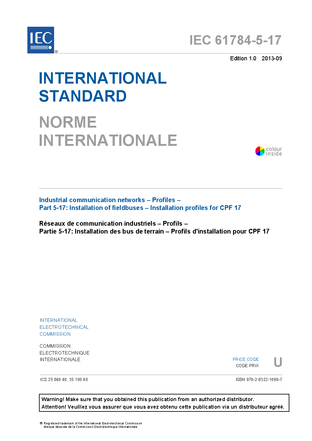 IEC 61784-5-17:2013 Industrial communication networks - Profiles - Part 5-17: Installation of fieldbuses - Installation profiles for CPF 17