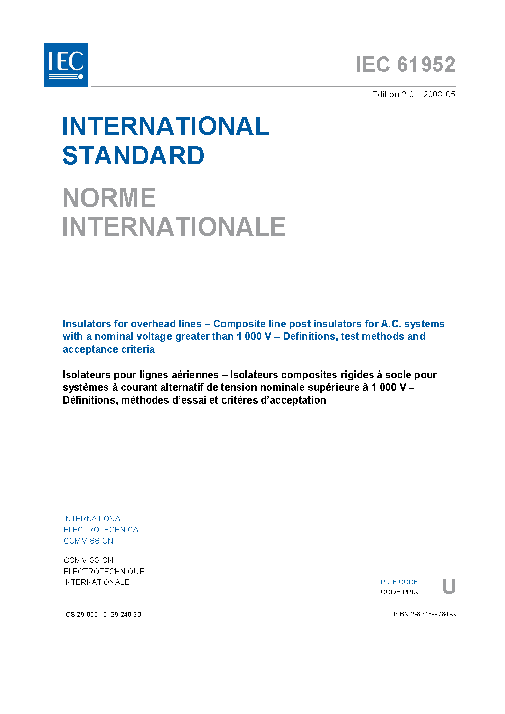 IEC 61952:2008 Insulators for overhead lines - Composite line post insulators for A.C. systems with a nominal voltage greater than 1 000 V - Definitions, test methods and acceptance criteria