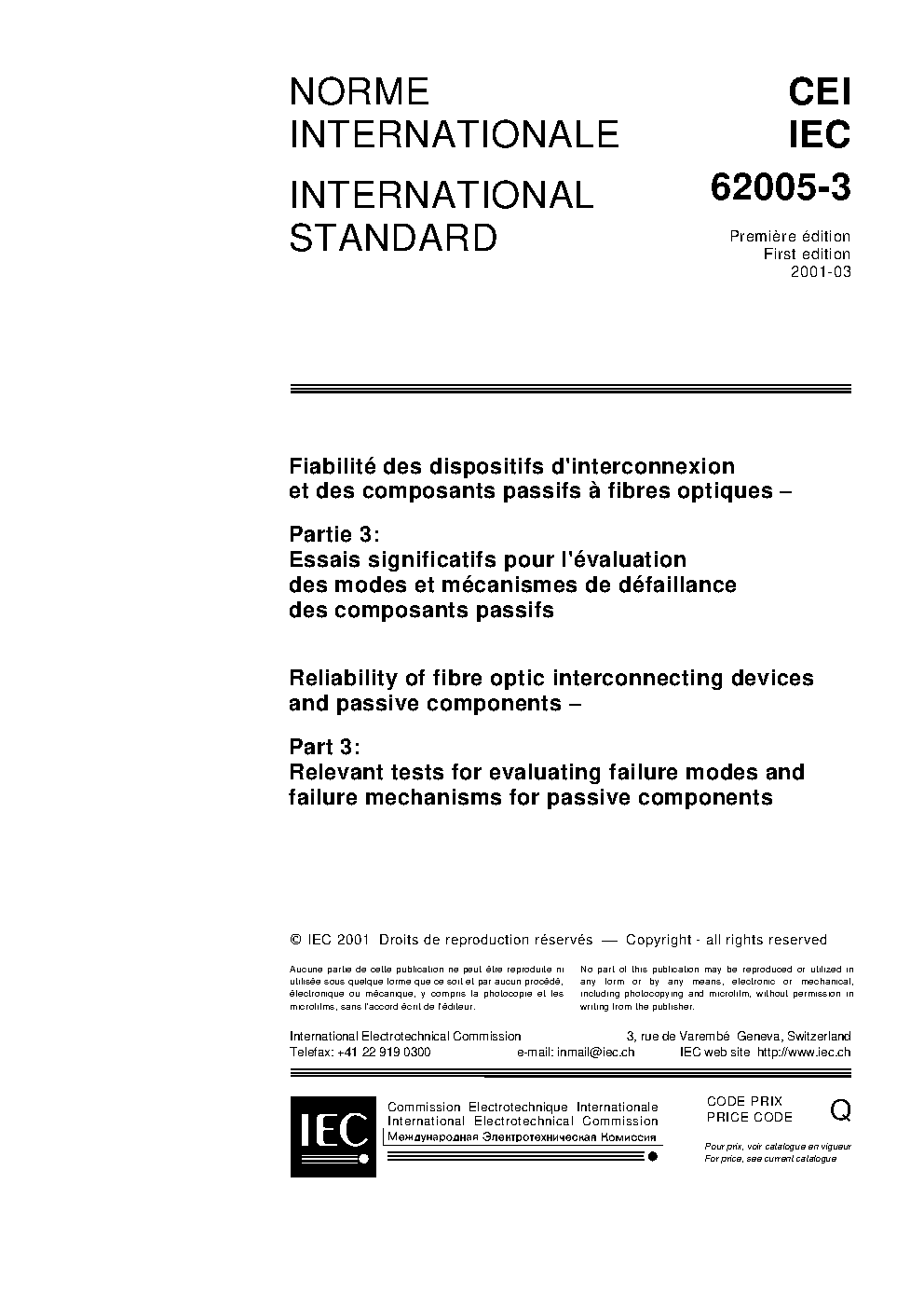 IEC 62005-3:2001 Reliability of fibre optic interconnecting devices and passive components - Part 3: Relevant tests for evaluating failure modes and failure mechanisms for passive components