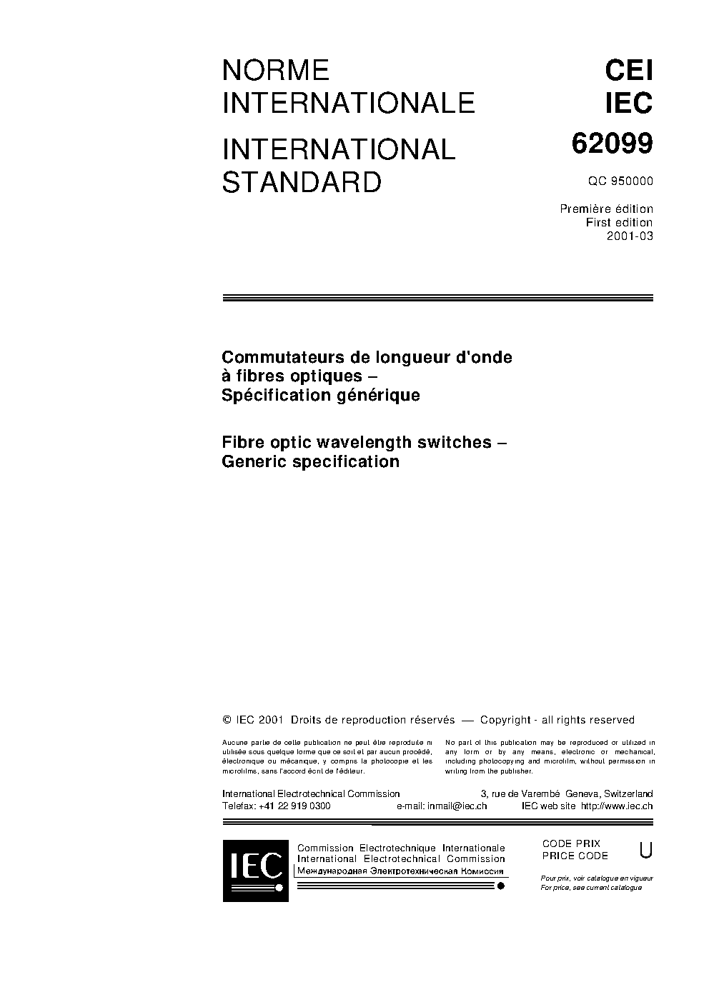 IEC 62099:2001 Fibre optic wavelength switches - Generic specification