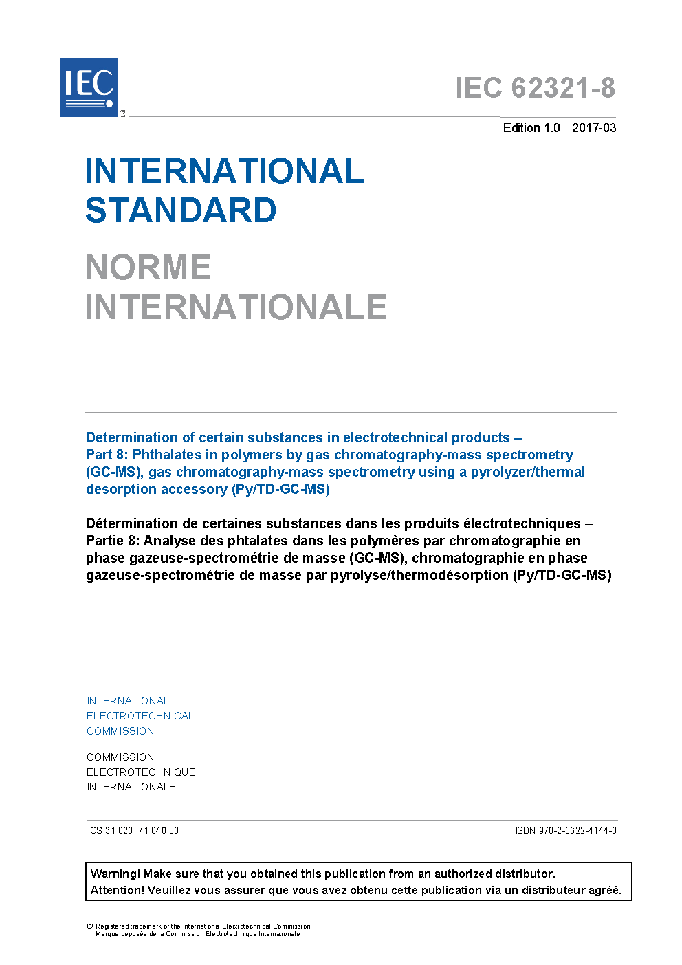 IEC 62321-8:2017 Determination of certain substances in electrotechnical products - Part 8: Phthalates in polymers by gas chromatography-mass spectrometry (GC-MS), gas chromatography-mass spectrometry using a pyrolyzer/thermal desorption accessory (Py-TD-GC-MS)