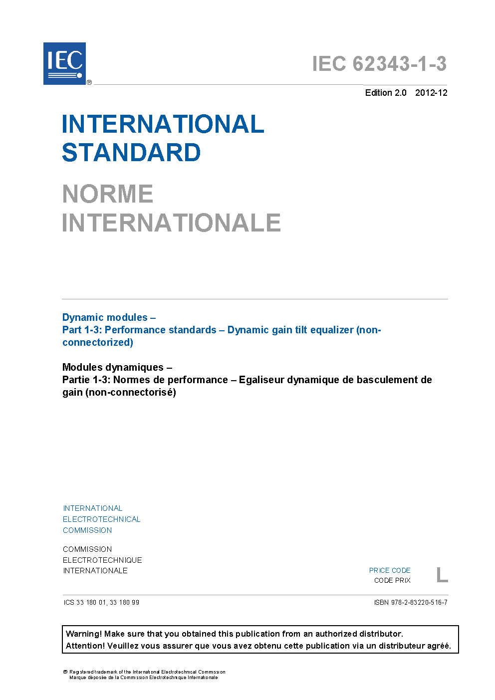 IEC 62343-1-3:2012 Dynamic modules - Part 1-3: Performance standards - Dynamic gain tilt equalizer (non-connectorized)