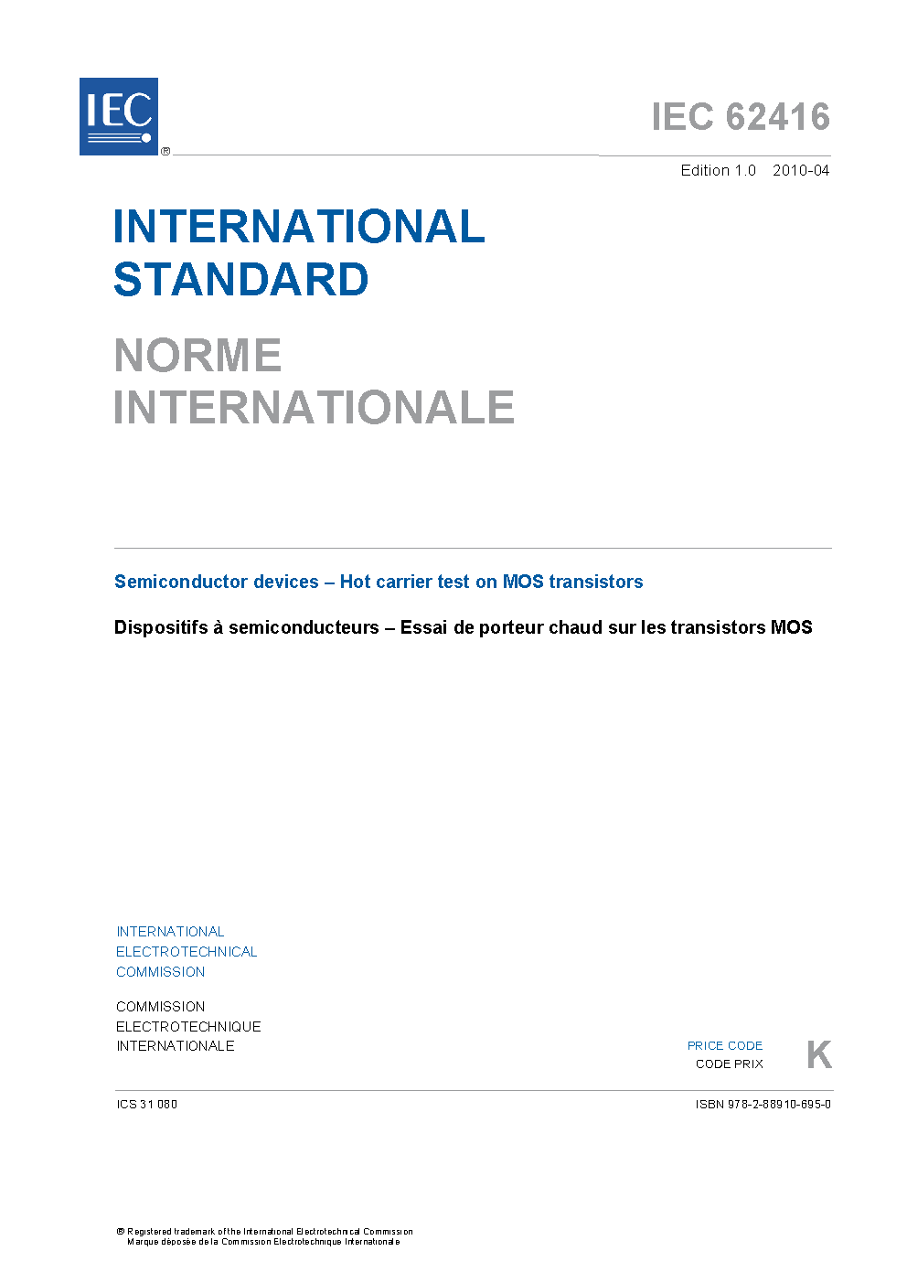 IEC 62416:2010 describes the wafer level hot carrier test on NMOS and PMOS transistors. The test is intended to determine whether the single transistors in a certain (C)MOS process meet the required hot carrier lifetime.
